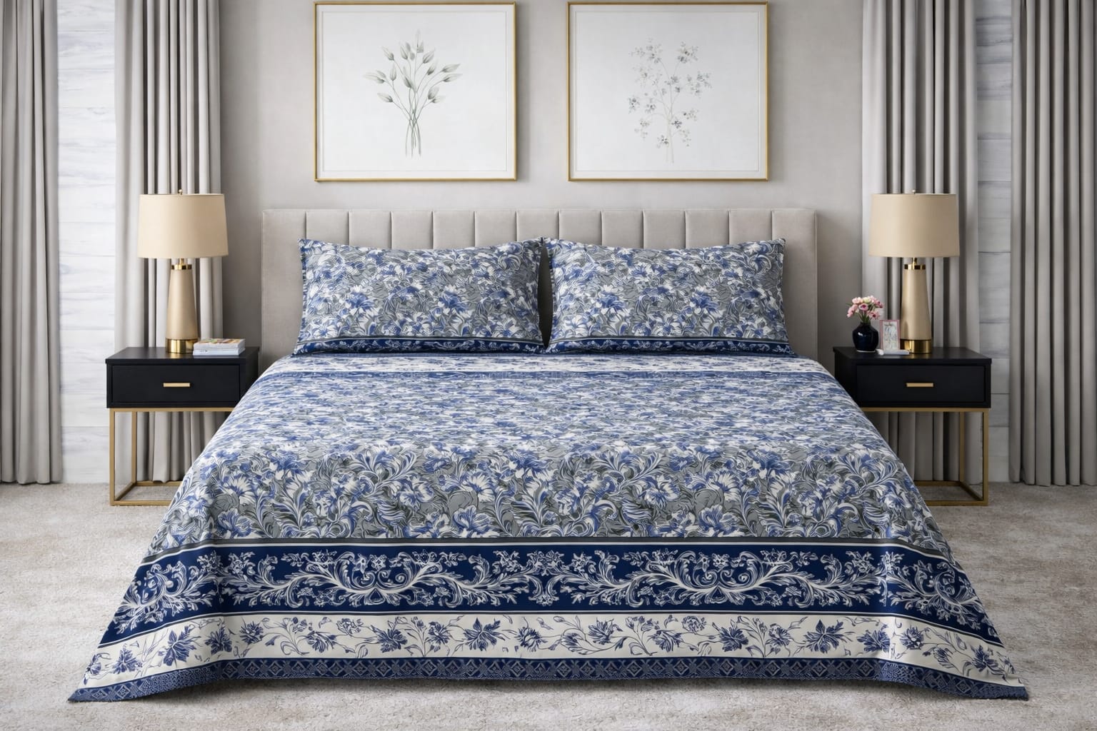 Transform your bedroom with the timeless beauty of the Blue Vintage Garden Cotton King Size Bedsheet Set. Featuring a soothing white base filled with intricate blue floral prints and a richly detailed ornamental border, this bedsheet brings a calm, royal, and hotel-style feel to your space. The graceful design creates a perfect balance between modern freshness and traditional elegance.