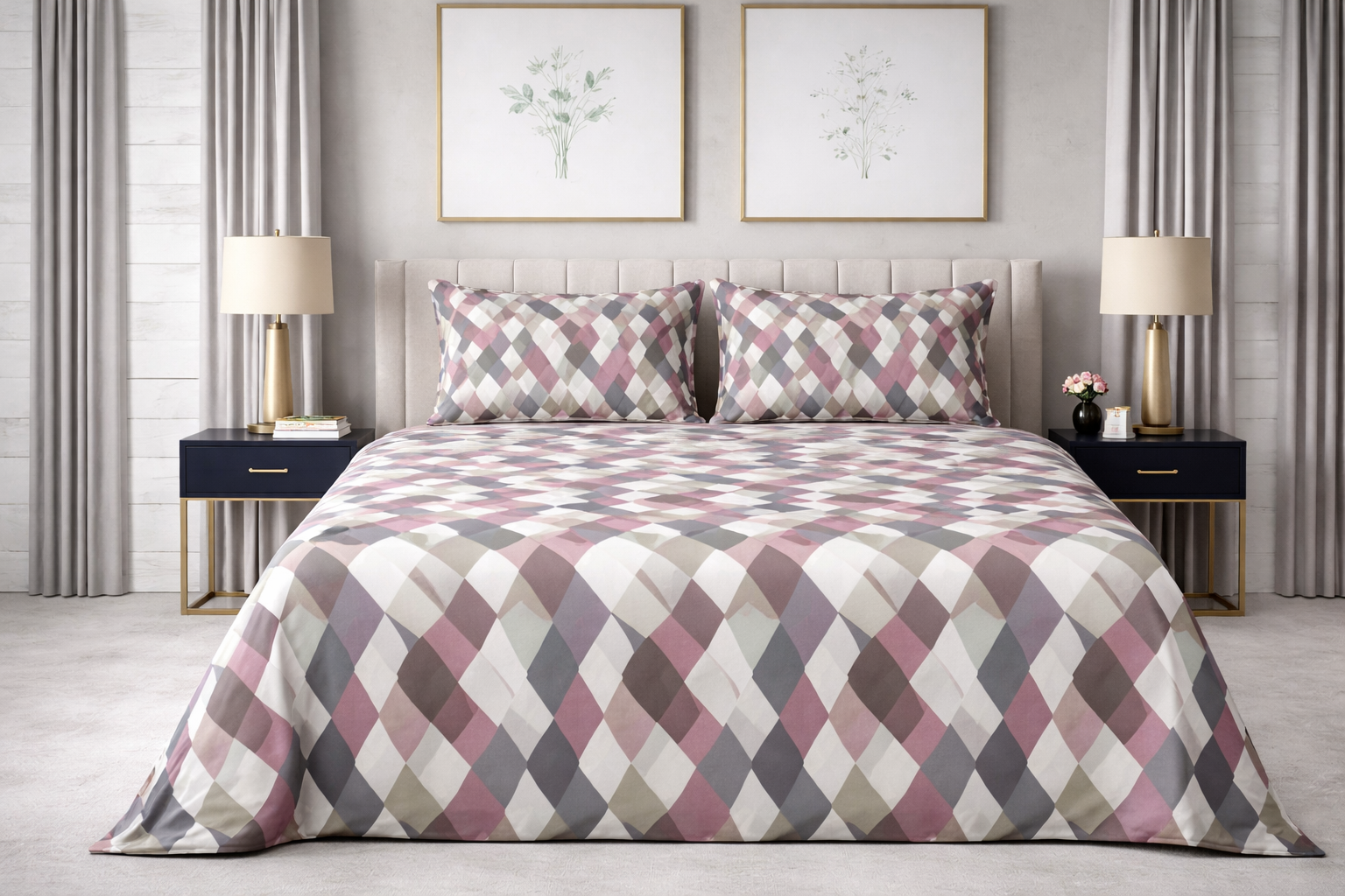 Give your bedroom a modern and elegant upgrade with the Blush Diamond Pure Cotton King Size Bedsheet Set. Featuring a stylish geometric diamond pattern in soft blush pink, grey, beige, and off-white tones, this design adds a sophisticated and contemporary touch to your space.