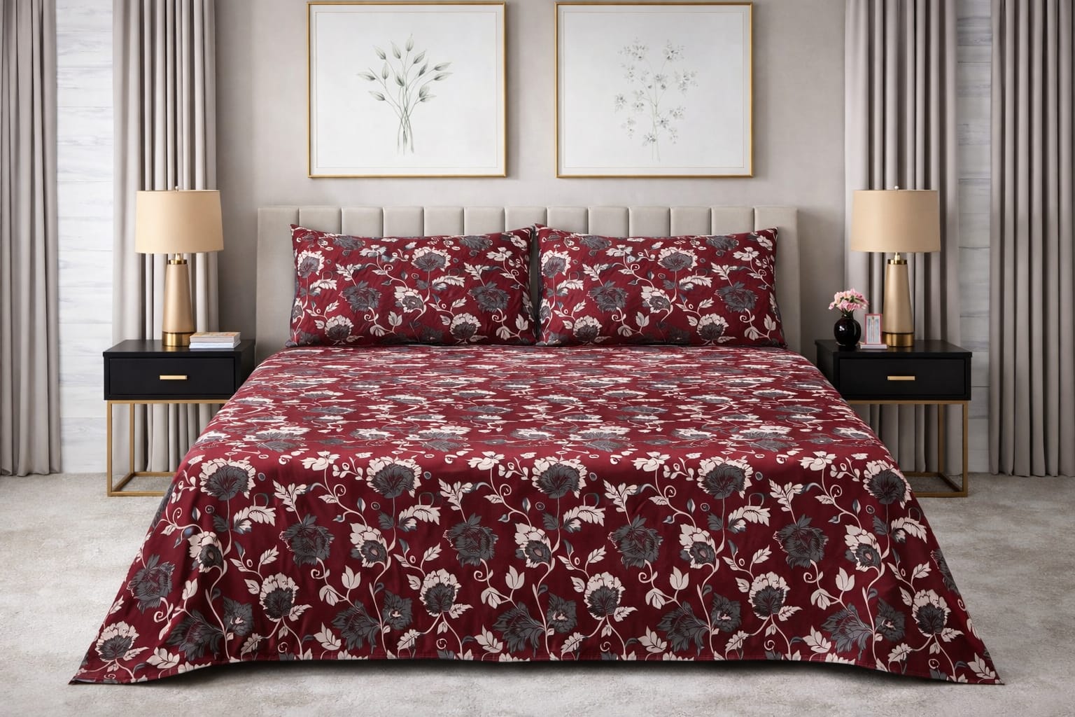 Give your bedroom a bold and graceful touch with the Maroon Floral Charm Cotton King Size Bedsheet Set. Featuring a deep maroon base with beautifully detailed grey and beige floral patterns, this bedsheet creates a cozy, sophisticated, and inviting atmosphere. The evenly spread design gives your bed a neat, balanced, and premium finish.